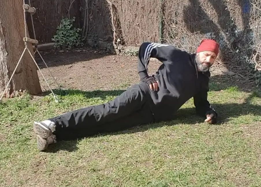 - 30″ Caidas laterales de cadera en side elbow plank.